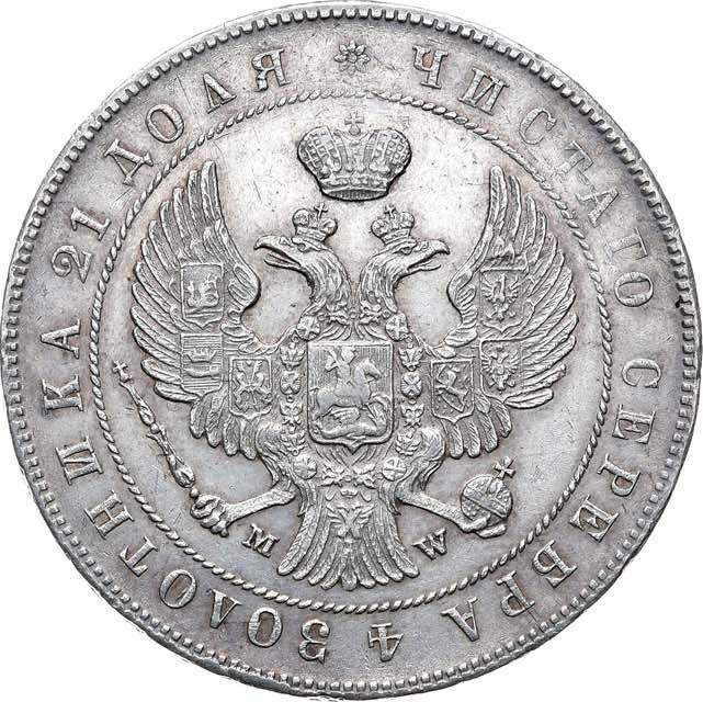 Find out the current coin value of the Russian Rouble 1847 "Warsaw Mint" with mark MW. Eagle's tail fanned out. This silver coin from the times of Nicholas I struck at the Warsaw Mint. Wondering how much a coin like this is worth? The record price belongs to the lot 52664 sold at the Heritage Auctions auction for USD 7,763. Bidding took place May 29, 2008.
