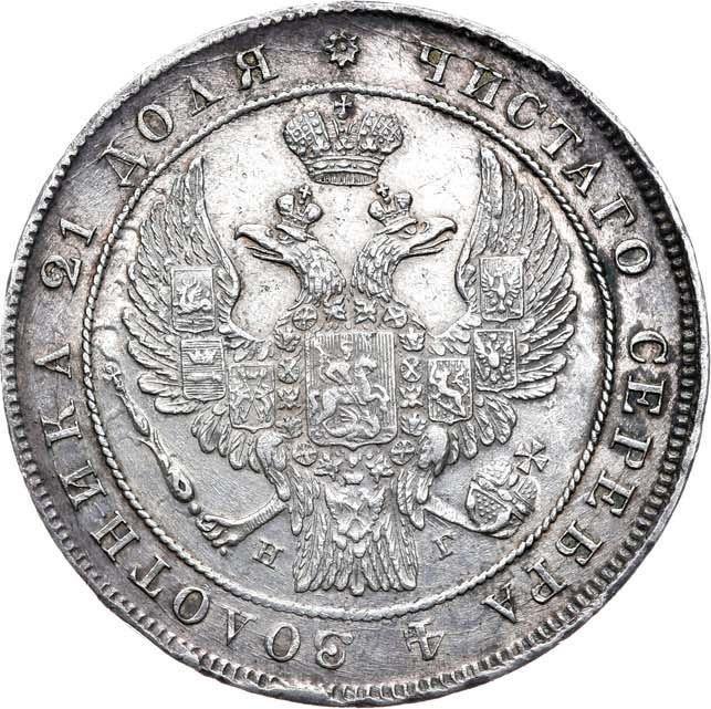 Find out the current coin value of the Russian Rouble 1837 "The eagle of the sample of 1832" with mark СПБ НГ. Wreath 7 links. This silver coin from the times of Nicholas I struck at the Saint Petersburg Mint. Wondering how much a coin like this is worth? The record price belongs to the lot 2097 sold at the The New York Sale auction for USD 18,000. Bidding took place January 11, 2024.