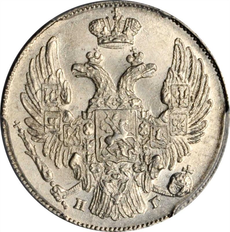 Find out the current coin value of the Russian 10 Kopeks 1834 "Eagle 1832-1839" with mark СПБ НГ. This silver coin from the times of Nicholas I struck at the Saint Petersburg Mint. Wondering how much a coin like this is worth? The record price belongs to the lot 392 sold at the Russian Heritage auction for USD 230,000. Bidding took place April 21, 2019.