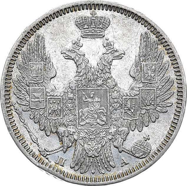 Find out the current coin value of the Russian 20 Kopeks 1850 "Eagle 1849-1851" with mark СПБ ПА. St George without cloak. This silver coin from the times of Nicholas I struck at the Saint Petersburg Mint. Wondering how much a coin like this is worth? The record price belongs to the lot 318 sold at the Alexander auction for USD 10,000. Bidding took place December 19, 2015.