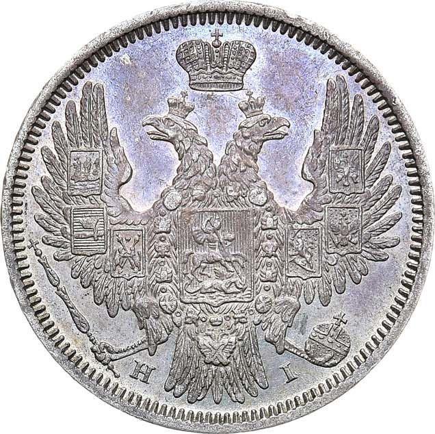 The information on the current value of the Russian coin 20 Kopeks 1853 "Eagle 1849-1851" with the letters СПБ HI is based on actual auction sales of similar specimens. To reflect the current price level, our service monitors over 590 numismatic companies and records auction results in the coin catalog and auction archive. Please note that the exact value depends directly on the coin's condition, so the average price serves only as an approximate estimate.