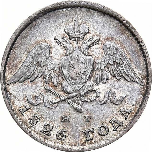 Find out the current coin value of the Russian 20 Kopeks 1826 "An eagle with lowered wings" with mark СПБ НГ. This silver coin from the times of Nicholas I struck at the Saint Petersburg Mint. Wondering how much a coin like this is worth? The record price belongs to the lot 841 sold at the SINCONA AG auction for CHF 4,250. Bidding took place October 9, 2012.