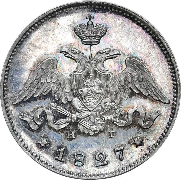 According to the latest data as of December 5, 2025 the average price of a Silver coin 25 Kopeks 1827 "An eagle with lowered wings" with mark СПБ НГ, The shield touches the crown is 450 USD for regular strike and 10000 USD for coins minted using the PROOF technology.