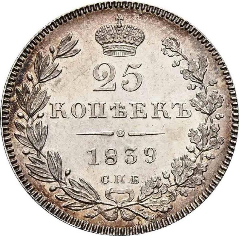 The information on the current value of the Russian coin 25 Kopeks 1839 "Eagle 1839-1843" with the letters СПБ НГ is based on actual auction sales of similar specimens. To reflect the current price level, our service monitors over 590 numismatic companies and records auction results in the coin catalog and auction archive. Please note that the exact value depends directly on the coin's condition, so the average price serves only as an approximate estimate.