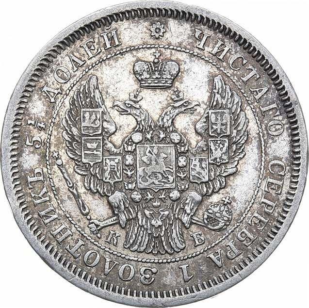 Find out the current coin value of the Russian 25 Kopeks 1844 "Eagle 1845-1847" with mark СПБ КБ. This silver coin from the times of Nicholas I struck at the Saint Petersburg Mint. Wondering how much a coin like this is worth? The record price belongs to the lot 8627 sold at the Fritz Rudolf Künker GmbH & Co. KG auction for EUR 5,000. Bidding took place October 9, 2008.