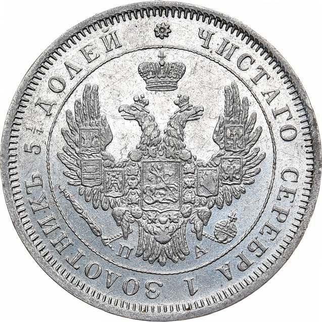 According to the latest data as of December 5, 2025 the average price of a Silver coin 25 Kopeks 1850 "Eagle 1850-1858" with mark СПБ ПА is 180 USD for regular strike and 1700 USD for coins minted using the PROOF technology.
