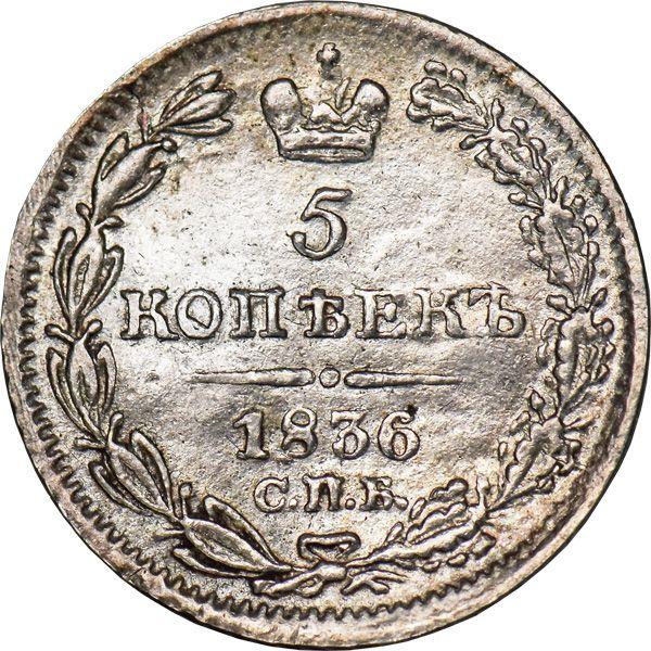 The information on the current value of the Russian coin 5 Kopeks 1836 "Eagle 1832-1844" with the letters СПБ НГ is based on actual auction sales of similar specimens. To reflect the current price level, our service monitors over 590 numismatic companies and records auction results in the coin catalog and auction archive. Please note that the exact value depends directly on the coin's condition, so the average price serves only as an approximate estimate.