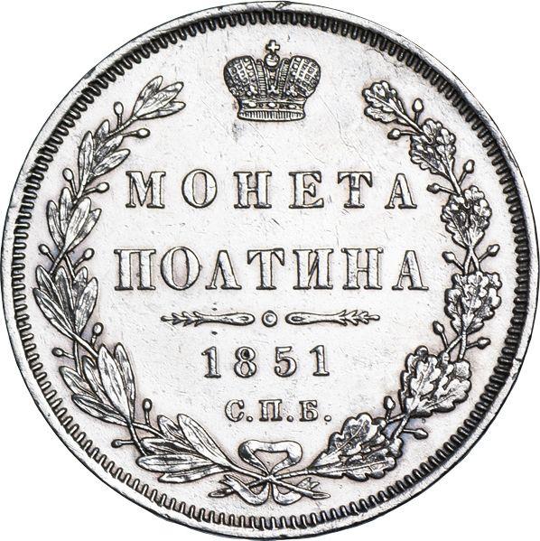 Find out the current coin value of the Russian Poltina 1851 "Eagle 1848-1858" with mark СПБ ПА. This silver coin from the times of Nicholas I struck at the Saint Petersburg Mint. Wondering how much a coin like this is worth? The record price belongs to the lot 1281 sold at the Fritz Rudolf Künker GmbH & Co. KG auction for EUR 2,400. Bidding took place January 28, 2010.