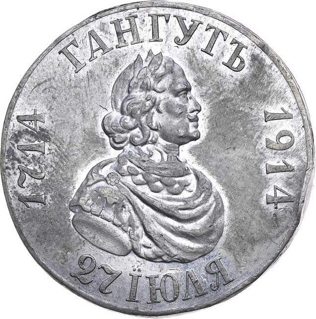 Find out the current coin value of the Russian Rouble 1914 "In memory of the 200th anniversary of the Battle of Gangut". One-sided impression in tin. This tin coin from the times of Nicholas II