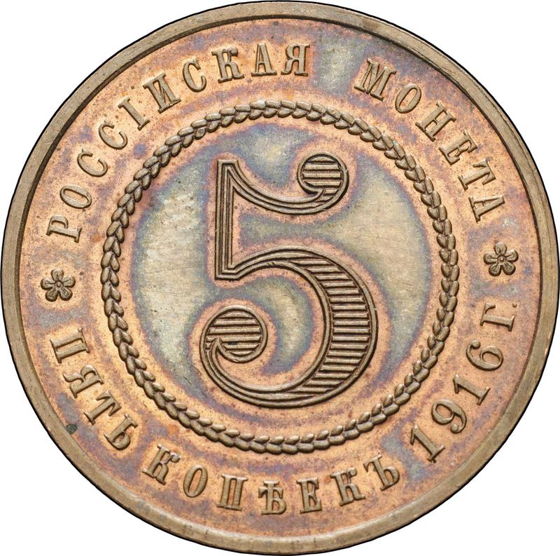 Find out the current coin value of the Russian Pattern 5 Kopeks 1916 . This copper coin from the times of Nicholas II. Wondering how much a coin like this is worth? The record price belongs to the lot 958 sold at the Renaissance Auctions LLC auction for USD 2,900. Bidding took place August 13, 2000.