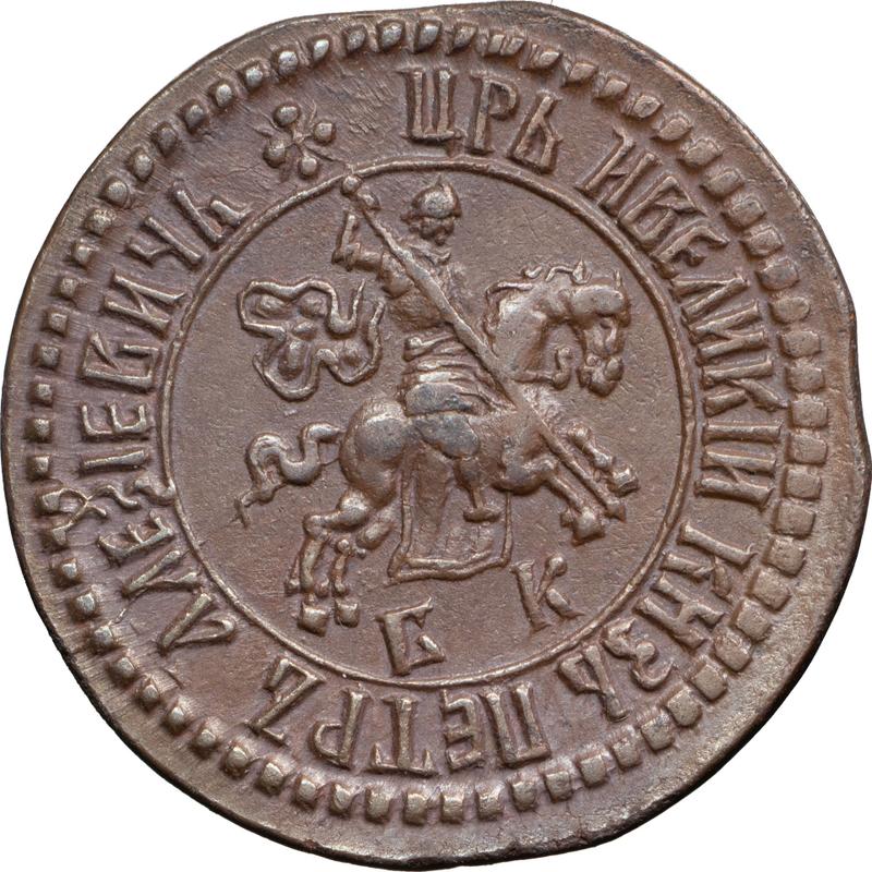 Find out the current coin value of the Russian 1 Kopek ҂АΨД (1704) with mark БК. This copper coin from the times of Peter I. Wondering how much a coin like this is worth? The record price belongs to the lot 20 sold at the SINCONA AG auction for CHF 7,000. Bidding took place October 14, 2013.