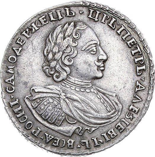 Poltina ҂АΨК (1720) "Portrait in shoulder pads". Without a branch on chest (Russia, Peter I)
