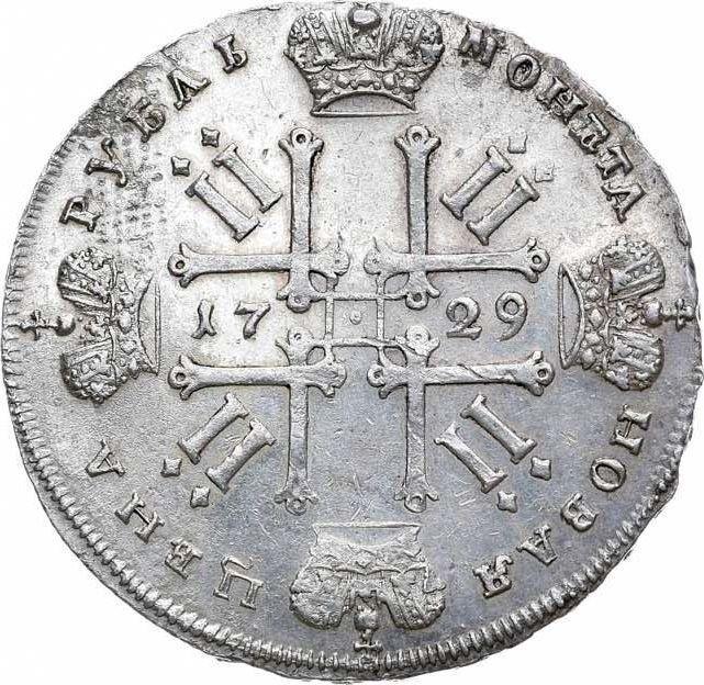 Find out the current coin value of the Russian Rouble 1729 . Without a star on the chest. This silver coin from the times of Peter II struck at the Moscow (Kadashevskaya Sloboda) Mint. Wondering how much a coin like this is worth? The record price belongs to the lot 29 sold at the Empire auction for RUB 420,000. Bidding took place December 10, 2011.