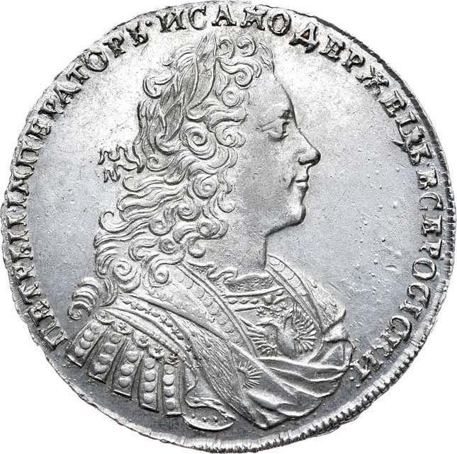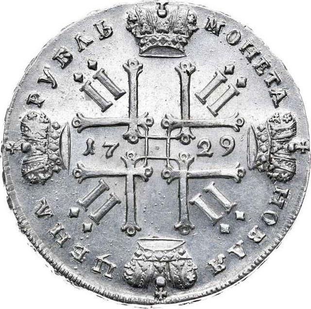 Find out the current coin value of the Russian Rouble 1729 . With a star on chest. This silver coin from the times of Peter II struck at the Moscow (Kadashevskaya Sloboda) Mint. Wondering how much a coin like this is worth? The record price belongs to the lot 1050 sold at the The New York Sale auction for USD 12,000. Bidding took place January 6, 2011.