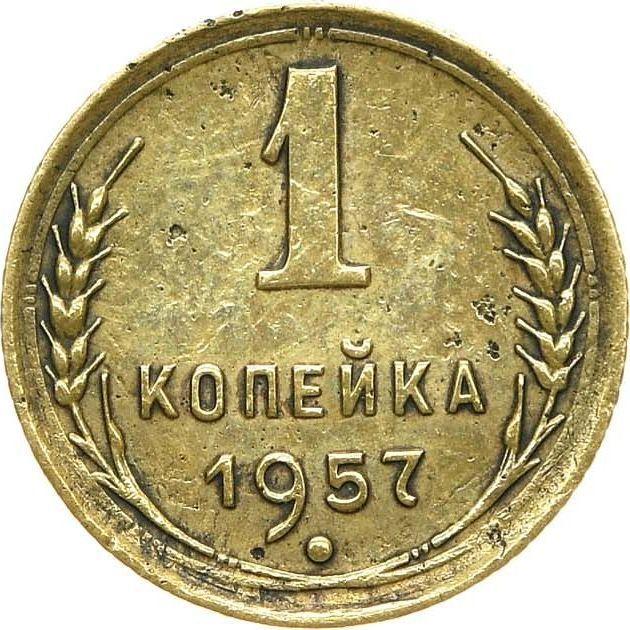 Find out the current coin value of the Russian 1 Kopek 1957 . Wreath with 16 ribbons. This aluminum-bronze coin from the times of USSR. Wondering how much a coin like this is worth? The record price belongs to the lot 694 sold at the Rare Coins auction for RUB 225,000. Bidding took place October 2, 2021.
