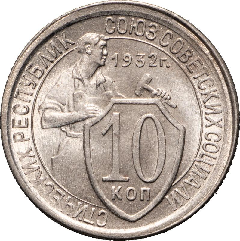 Find out the current coin value of the Russian 10 Kopeks 1932 . This copper-nickel coin from the times of USSR. Wondering how much a coin like this is worth? The record price belongs to the lot 182 sold at the MS67 auction for RUB 20,000. Bidding took place March 31, 2018.