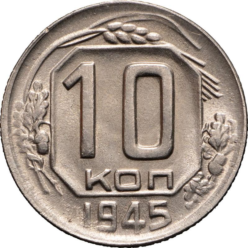Find out the current coin value of the Russian 10 Kopeks 1945 . This copper-nickel coin from the times of USSR. Wondering how much a coin like this is worth? The record price belongs to the lot 213 sold at the Coins and Medals auction for RUB 24,300. Bidding took place June 25, 2022.