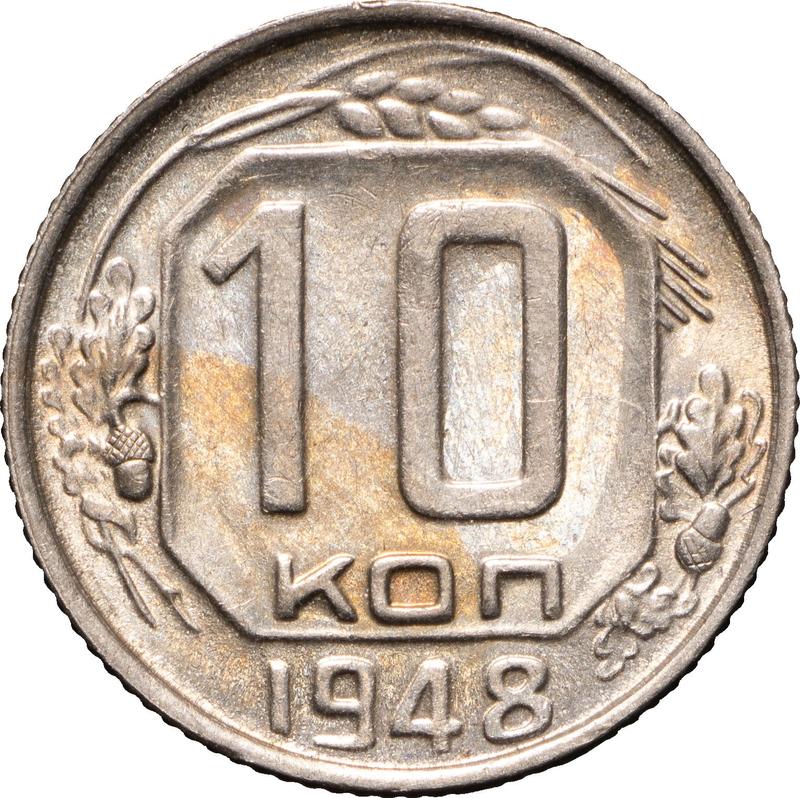 Find out the current coin value of the Russian 10 Kopeks 1948 . This copper-nickel coin from the times of USSR. Wondering how much a coin like this is worth? The record price belongs to the lot 520 sold at the Empire auction for RUB 170,000. Bidding took place June 4, 2016.