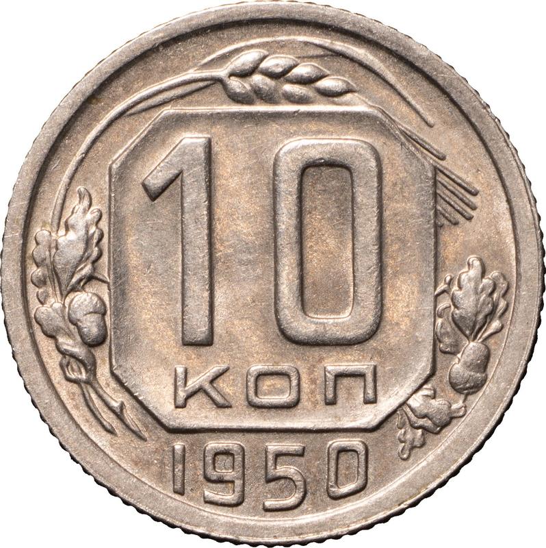 Find out the current coin value of the Russian 10 Kopeks 1950 . This copper-nickel coin from the times of USSR. Wondering how much a coin like this is worth? The record price belongs to the lot 306 sold at the Rare Coins auction for USD 675. Bidding took place October 22, 2016.