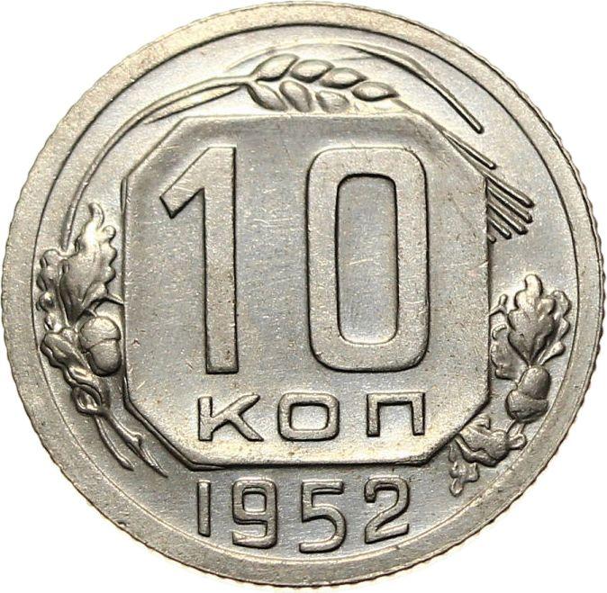 Find out the current coin value of the Russian 10 Kopeks 1952 . This copper-nickel coin from the times of USSR. Wondering how much a coin like this is worth? The record price belongs to the lot 326 sold at the Rare Coins auction for USD 320. Bidding took place October 22, 2016.