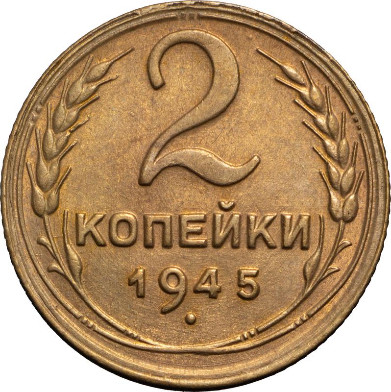 Find out the current coin value of the Russian 2 Kopeks 1945 . This aluminum-bronze coin from the times of USSR. Wondering how much a coin like this is worth? The record price belongs to the lot 275 sold at the Rare Coins auction for USD 925. Bidding took place October 22, 2016.