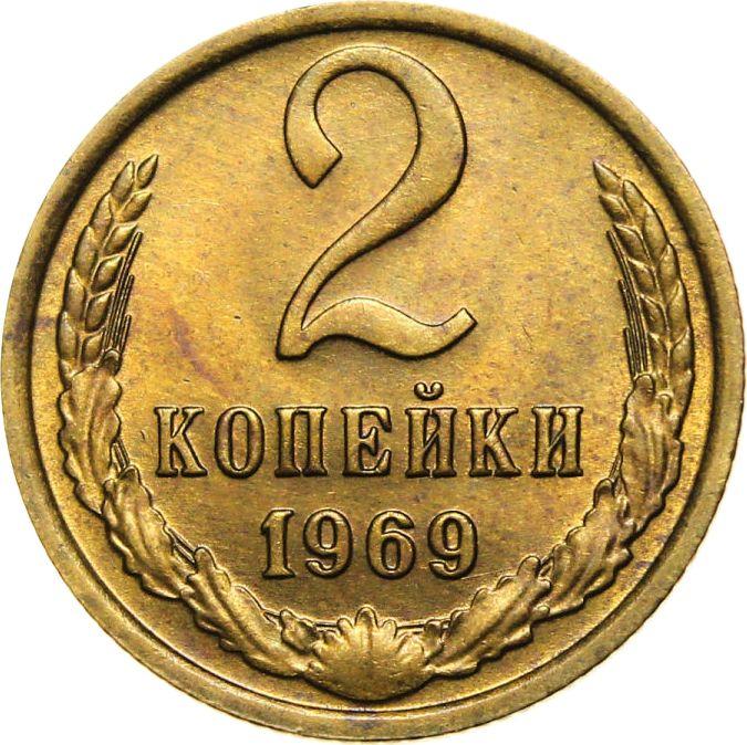 Find out the current coin value of the Russian 2 Kopeks 1969 . This tombac coin from the times of USSR. Wondering how much a coin like this is worth? The record price belongs to the lot 346 sold at the Klondike Auction auction for EUR 35. Bidding took place July 20, 2025.