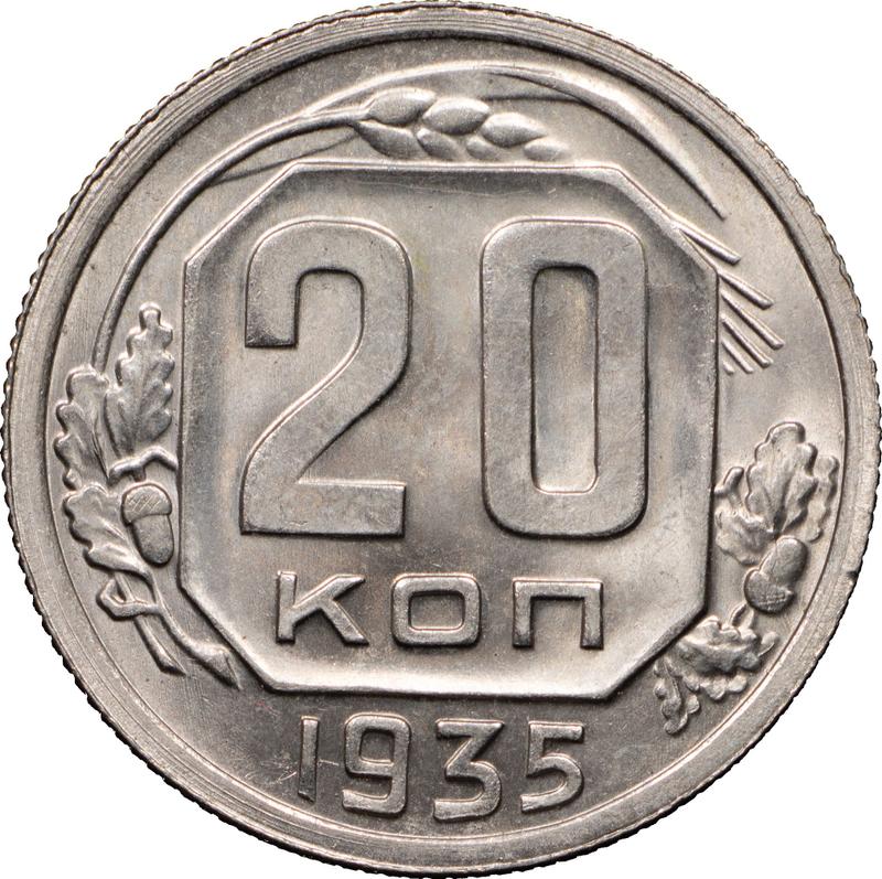 Find out the current coin value of the Russian 20 Kopeks 1935 . Smooth star. This copper-nickel coin from the times of USSR. Wondering how much a coin like this is worth? The record price belongs to the lot 582 sold at the Rare Coins auction for RUB 150,000. Bidding took place June 5, 2021.