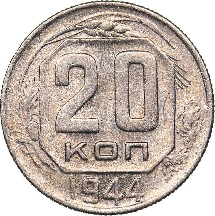 Find out the current coin value of the Russian 20 Kopeks 1944 . This copper-nickel coin from the times of USSR. Wondering how much a coin like this is worth? The record price belongs to the lot 347 sold at the Rare Coins auction for USD 750. Bidding took place October 5, 2019.