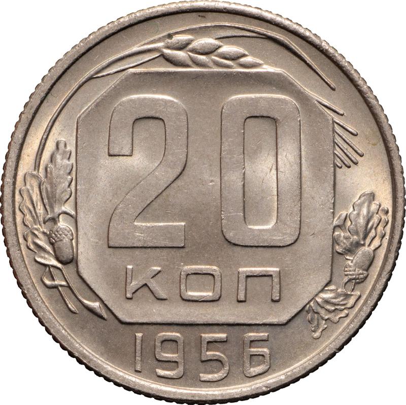 Find out the current coin value of the Russian 20 Kopeks 1956 . This copper-nickel coin from the times of USSR. Wondering how much a coin like this is worth? The record price belongs to the lot 496 sold at the Coins and Medals auction for RUB 62,000. Bidding took place September 22, 2023.