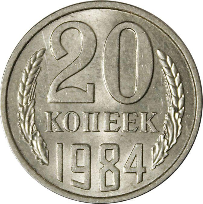 Find out the current coin value of the Russian 20 Kopeks 1984 . This nickel silver coin from the times of USSR. Wondering how much a coin like this is worth? The record price belongs to the lot 1448 sold at the Rare Coins auction for RUB 2,800. Bidding took place April 21, 2024.
