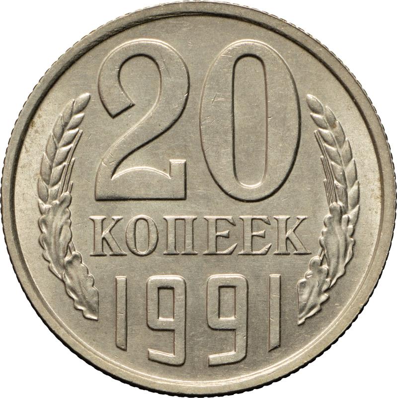 Find out the current coin value of the Russian 20 Kopeks 1991 . Without mintmark. This nickel silver coin from the times of USSR. Wondering how much a coin like this is worth? The record price belongs to the lot 543 sold at the Empire auction for RUB 22,000. Bidding took place April 28, 2012.