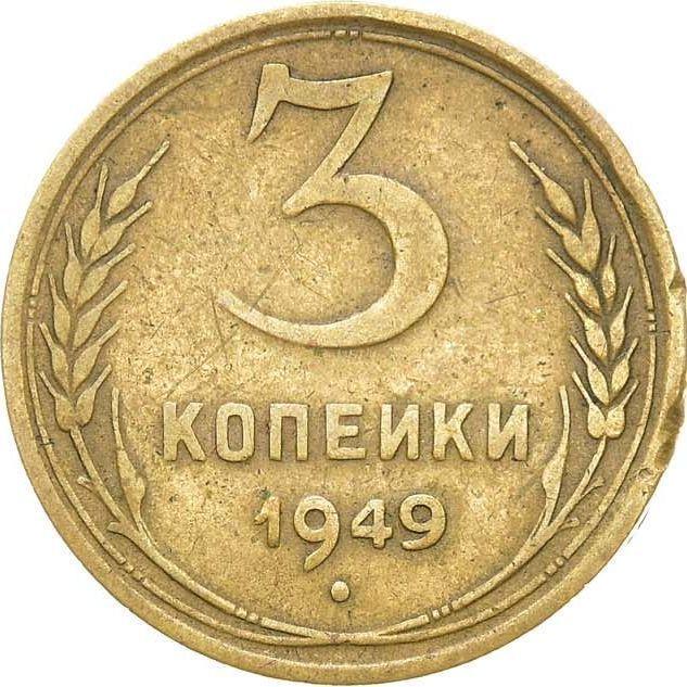 Find out the current coin value of the Russian 3 Kopeks 1949 . Smooth star. This aluminum-bronze coin from the times of USSR. Wondering how much a coin like this is worth? The record price belongs to the lot 680 sold at the Coins and Medals auction for RUB 102,000. Bidding took place December 13, 2024.