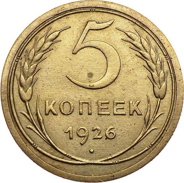 Find out the current coin value of the Russian 5 Kopeks 1926 . This aluminum-bronze coin from the times of USSR. Wondering how much a coin like this is worth? The record price belongs to the lot 25917 sold at the Heritage Auctions auction for USD 15,275. Bidding took place April 10, 2014.