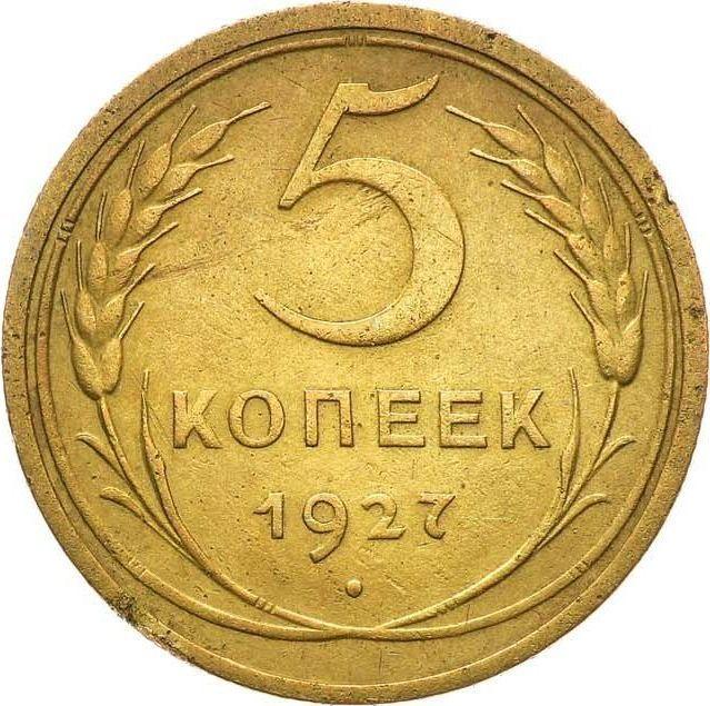 Find out the current coin value of the Russian 5 Kopeks 1927 . This aluminum-bronze coin from the times of USSR. Wondering how much a coin like this is worth? The record price belongs to the lot 295 sold at the Rare Coins auction for USD 6,000. Bidding took place April 20, 2019.