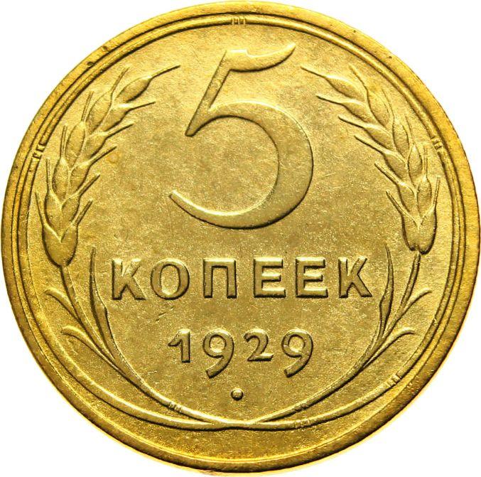 Find out the current coin value of the Russian 5 Kopeks 1929 . This aluminum-bronze coin from the times of USSR. Wondering how much a coin like this is worth? The record price belongs to the lot 477 sold at the AURORA auction for RUB 210,000. Bidding took place September 29, 2022.