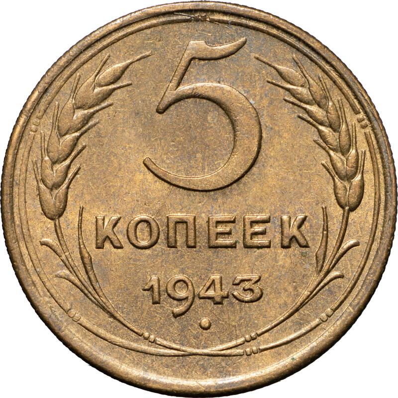 Find out the current coin value of the Russian 5 Kopeks 1943 . This aluminum-bronze coin from the times of USSR. Wondering how much a coin like this is worth? The record price belongs to the lot 912 sold at the Rare Coins auction for RUB 120,000. Bidding took place June 8, 2024.