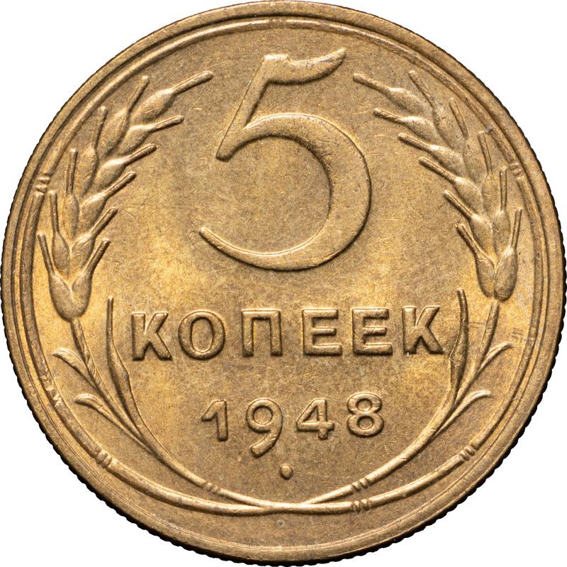 Find out the current coin value of the Russian 5 Kopeks 1948 . This aluminum-bronze coin from the times of USSR. Wondering how much a coin like this is worth? The record price belongs to the lot 234 sold at the Coins and Medals auction for RUB 32,000. Bidding took place June 25, 2022.