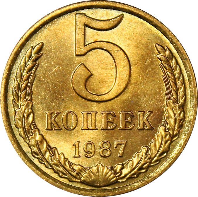 Find out the current coin value of the Russian 5 Kopeks 1987 . This tombac coin from the times of USSR. Wondering how much a coin like this is worth? The record price belongs to the lot 325 sold at the MS67 auction for RUB 1,600. Bidding took place May 15, 2019.