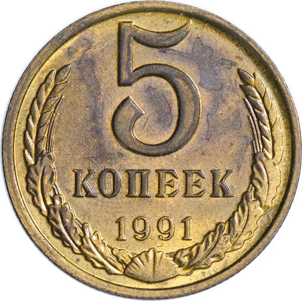 Find out the current coin value of the Russian 5 Kopeks 1991 with mark М. This tombac coin from the times of USSR struck at the Moscow Mint. Wondering how much a coin like this is worth? The record price belongs to the lot 1694 sold at the Coins and Medals auction for RUB 4,200. Bidding took place June 16, 2023.