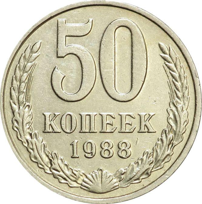 Find out the current coin value of the Russian 50 Kopeks 1988 . This nickel silver coin from the times of USSR. Wondering how much a coin like this is worth? The record price belongs to the lot 569 sold at the Empire auction for RUB 8,500. Bidding took place February 1, 2020.