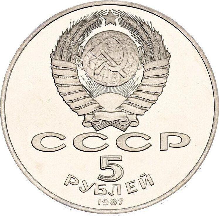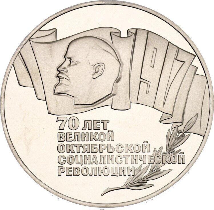 Find out the current coin value of the Russian 5 Roubles 1987 "70 years of the October Revolution". This copper-nickel coin from the times of USSR struck at the Leningrad Mint. Wondering how much a coin like this is worth? The record price belongs to the lot 1718 sold at the Katz Auction auction for EUR 135. Bidding took place August 15, 2023.