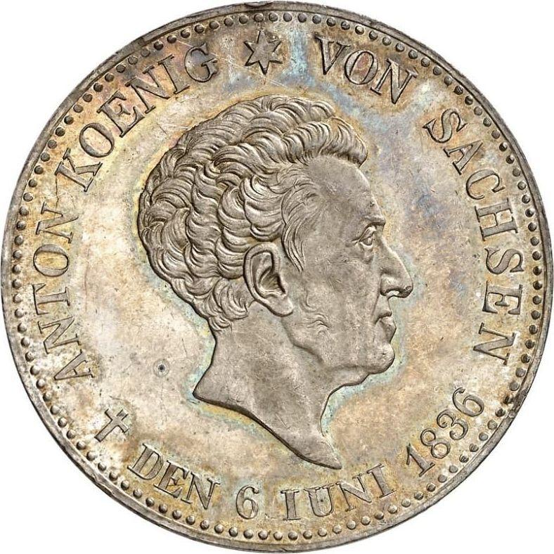 Find out the current coin value of the Saxony-Albertine Thaler 1836 "Death of the King" with mark G. Edge "SEGEN DES BERGBAUS". This silver coin from the times of Anthony struck at the Dresden Mint. Wondering how much a coin like this is worth? The record price belongs to the lot 188 sold at the Fritz Rudolf Künker GmbH & Co. KG auction for EUR 8,500. Bidding took place January 29, 2015.