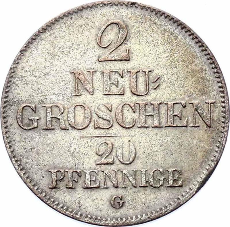 Find out the current coin value of the Saxony-Albertine 2 Neu Groschen 1842 with mark G. This silver coin from the times of Frederick Augustus II struck at the Dresden Mint. Wondering how much a coin like this is worth? The record price belongs to the lot 1087 sold at the WAG online Auktionen oHG auction for EUR 125. Bidding took place September 1, 2019.