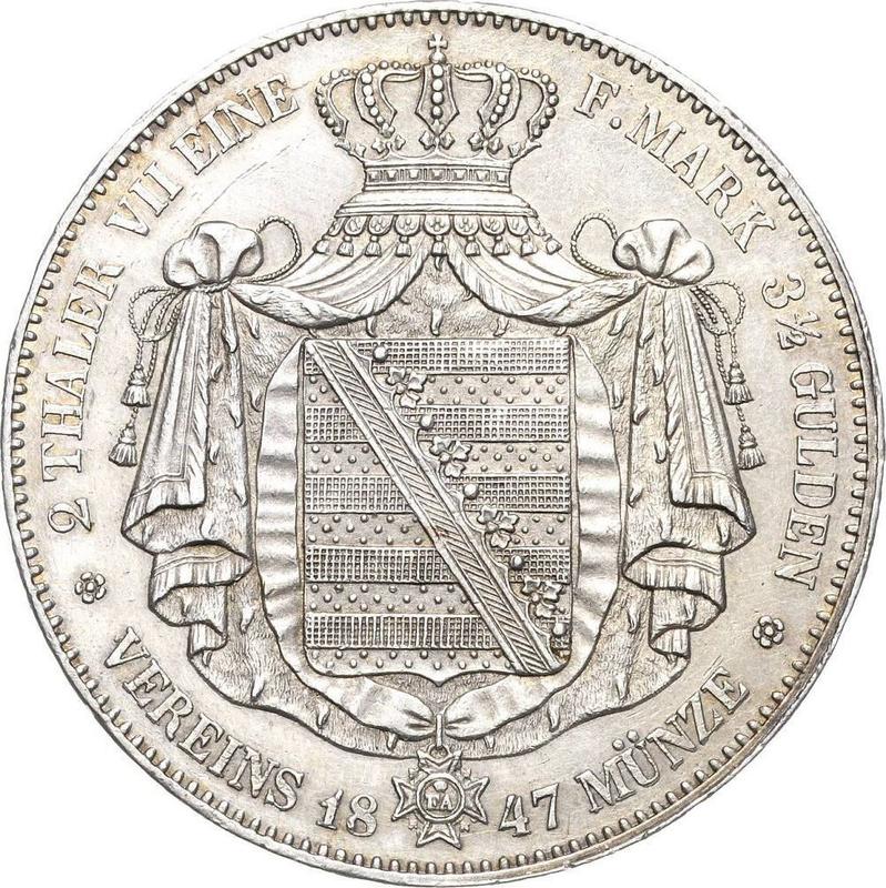 Find out the current coin value of the Saxony-Albertine 2 Thaler 1847 with mark F. This silver coin from the times of Frederick Augustus II struck at the Dresden Mint. Wondering how much a coin like this is worth? The record price belongs to the lot 10357 sold at the Stack's Bowers auction for USD 950. Bidding took place November 17, 2012.