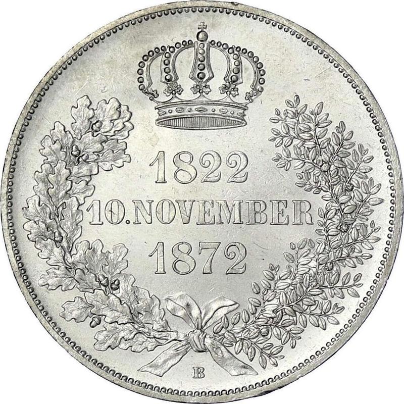 According to the latest data as of December 5, 2025 the average price of a Silver coin 2 Thaler 1872 "Golden Wedding" with mark B is 320 USD for regular strike and 5200 USD for coins minted using the PROOF technology.