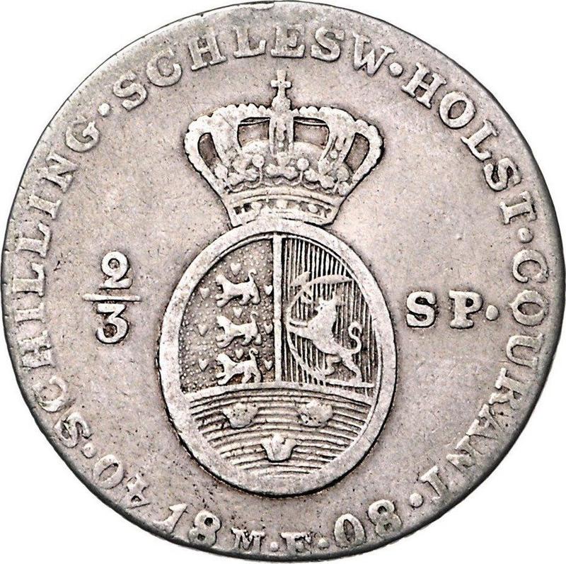 Find out the current coin value of the Schleswig-Holstein 2/3 Thaler 1808 with mark MF. This silver coin from the times of Christian VII. Wondering how much a coin like this is worth? The record price belongs to the lot 1297 sold at the Stephen Album Rare Coins auction for USD 220. Bidding took place March 7, 2022.
