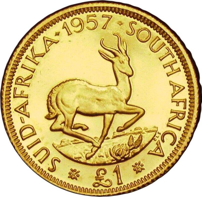 Find out the current coin value of the South African Pound 1957 . This gold coin from the times of Elizabeth II. Wondering how much a coin like this is worth? The record price belongs to the lot 1154 sold at the London Coins LTD auction for GBP 850. Bidding took place May 31, 2025.