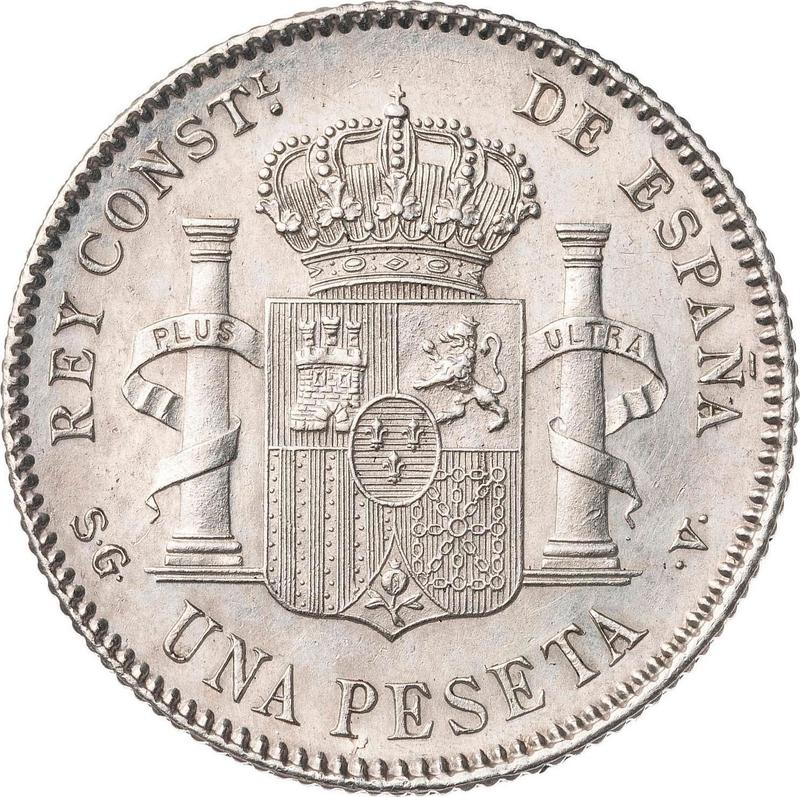 Find out the current coin value of the Spanish 1 Peseta 1899 with mark SGV. This silver coin from the times of Alfonso XIII struck at the Madrid Mint. Wondering how much a coin like this is worth? The record price belongs to the lot 1698 sold at the Aureo & Calicó, S.L. auction for EUR 900. Bidding took place December 16, 2015.
