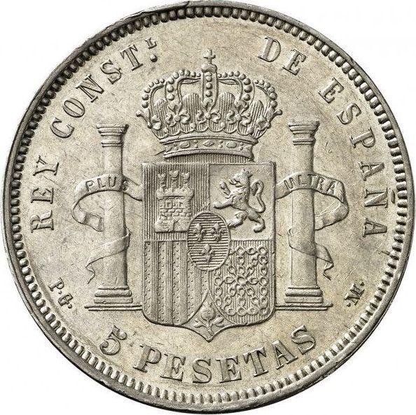 Find out the current coin value of the Spanish 5 Pesetas 1890 with mark PGM. This silver coin from the times of Alfonso XIII struck at the Madrid Mint. Wondering how much a coin like this is worth? The record price belongs to the lot 932 sold at the Aureo & Calicó, S.L. auction for EUR 650. Bidding took place October 20, 2021.