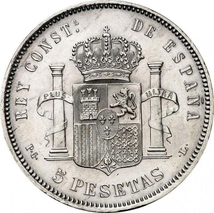Find out the current coin value of the Spanish 5 Pesetas 1893 with mark PGL. This silver coin from the times of Alfonso XIII struck at the Madrid Mint. Wondering how much a coin like this is worth? The record price belongs to the lot 25850 sold at the Heritage Auctions auction for USD 999. Bidding took place September 25, 2013.
